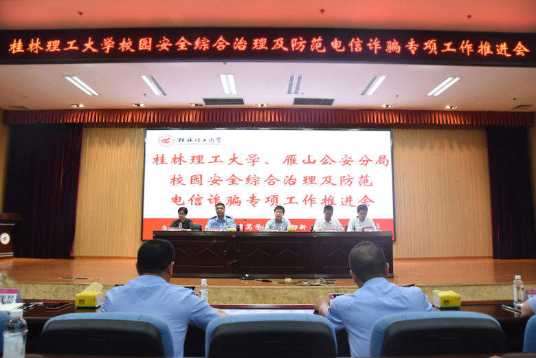 为营造和谐平安的校园环境,重点做好防范电信诈骗工作,6月12日下午,beat365与桂林市公安局雁山分局在雁山校区图书馆报告厅召开校园安全综合治理及防范电信诈骗专项工作推进会。学校副校长邓国彬,雁山区副区长、雁山公安分局局长卿立大出席会议并讲话。beat365保卫处、宣传部、学工(部)处、校团委等部门负责人、雁山公安分局相关领导,各学院分管学生工作副书记、辅导员以及学生代表参加了专项工作推进会。