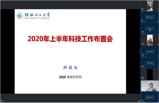 疫情期间,为保障学校科技工作有序进行,3月17日下午,学校召开全校2020年上半年科技工作视频布置会。王玫副校长、各学院分管科研副院长、科技处相关人员参加了视频会议。