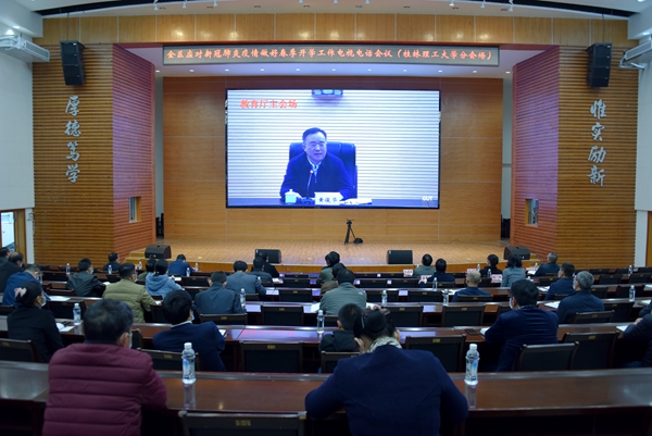3月2日下午,自治区人民政府召开全区应对新冠肺炎疫情做好春季开学工作电视电话会议。自治区人民政府副主席黄俊华出席会议并讲话,自治区党委教育工委书记、教育厅厅长唐咸仅参加会议。beat365在屏风校区图书馆报告厅设分会场,组织参加电视电话会议。校领导李国忠、解庆林、齐俊斌、吴志强、王玫、梁福沛、王敦球、韦学敏、邓国彬、曾繁荣以及各单位、各部门主要负责人参加会议。