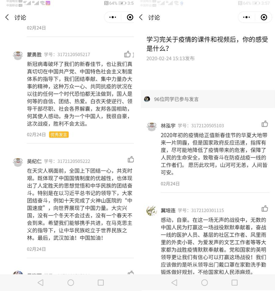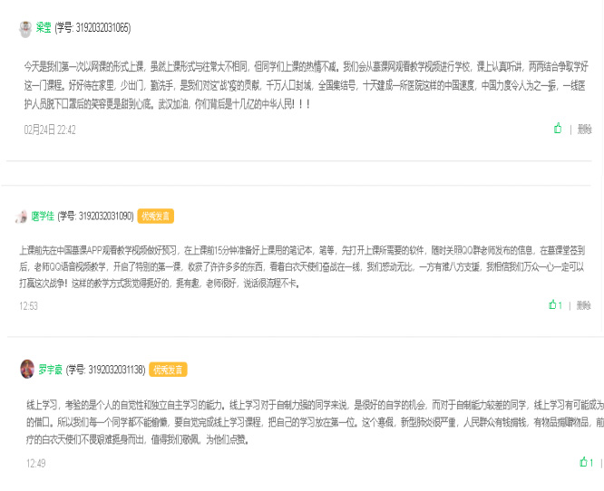 课堂上教师以直播、语音、问答、点评、主题探讨等模式进行授课,师生之间互动的积极性较高,不少学生在学习平台上积极地表达自己的学习心得和体会,与教师隔空互动。2月24日,全校共开设思政课39门次,共有4000余名学生参与到思政课线上课堂。课程效果良好,学生反响强烈。大家纷纷在网络上留言,表示,“通过开学第一课感触颇深,受到了一次思想洗礼,对生命的价值和意义有了新的思考。病毒虽然是可怕的,但是只要我们携手奋进,共克时艰,一定能取得最后的胜利!”