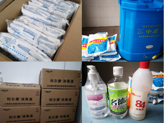 提前谋划物资。在全国医疗设备紧张的情况下,通过各种途径及渠道筹措了医用口罩1.5万只,消毒液150公斤,消毒片(三氯异氰尿酸消毒片)500公斤,消毒喷雾壶5个,额温枪26把,接受捐赠额温枪9把,护目镜350幅,75%酒精33公斤,手套500付等,给各部门、各学院发放口罩5000余只。