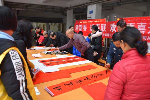 一大早,社区党群服务中心的社工及青年志愿者们,提前摆好书桌,笔墨纸砚,邀请了学校图书馆韦巍、材料学院张发爱、土建学院莫时旭、信息学院江汉强、学校保卫处王桂钢老师,为学校社区居民义写春联,社区居民们有的为事业兴旺,有的为全家安康,有的为家中添丁……都为未来美好的心愿络绎而来。