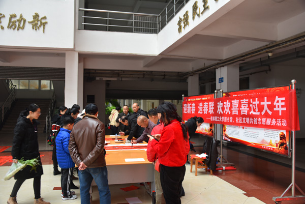 在新春佳节即将到来之际,1月22日上午,由学校图书馆、学校社区居委会、社区党群服务中心共同组织的一年一度义写春联活动,在学校屏风校区教九楼大厅举行。