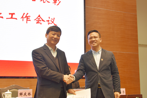 解庆林校长(左)代表学校与二级单位代表签订目标责任状