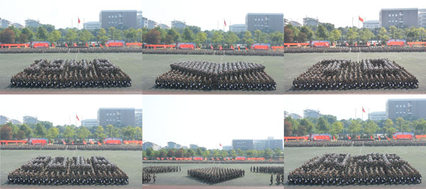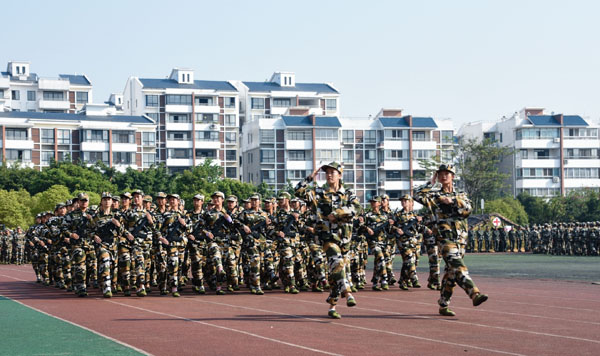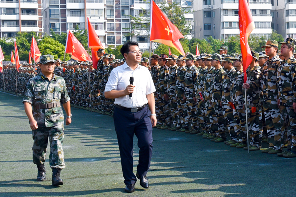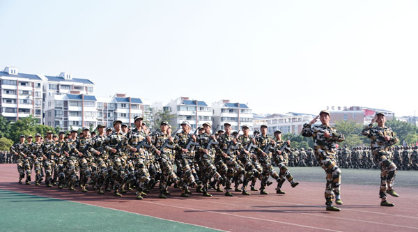 大会在庄严的国歌声中拉开帷幕。运动场上,46个连队早已列队完毕,他们军容严整、身姿挺拔,等待检阅。在雄壮的军乐声中,学校党委书记李国忠检阅了受训学生,“同学们辛苦了”、“为校争光”,同学们用嘹亮的口号展现了2019级新生饱满的精神状态。
