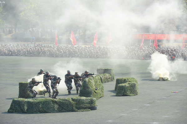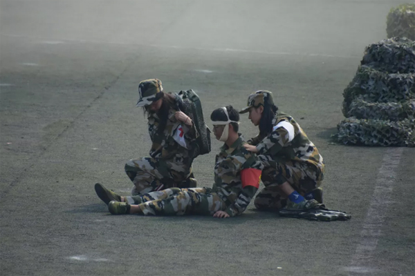 随后,男女持枪方阵、46个连队阅兵方阵依次接受检阅。在激烈的分列式进行曲中,受训新生迈着矫健的步伐依次走过主席台,接受领导的检阅。他们步伐坚定、口号嘹亮、斗志昂扬,充分展现了桂工学子的活力与风采。在军事项目表演中,首先进行表演的是男子刺杀操,刺杀操气势如虹,精神抖擞,体现了同学们顽强勇敢的战斗作风和不怕牺牲的英雄气概。接着是女子队列操表演,场上500名同学共同构成了“beat365官方网站、70周年、1949、2019”的字样,全场高呼“我爱中国、不忘初心,牢记使命”,这是同学们向新中国成立70周年献上的特别祝福与献礼。紧接着展示的军事项目是构筑工事、战术对抗和战场救护科目。