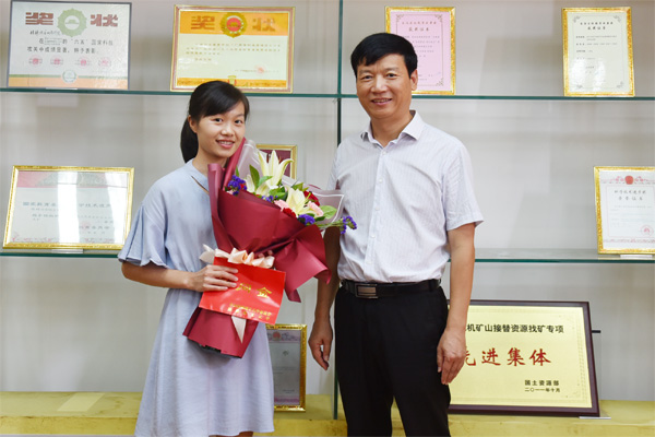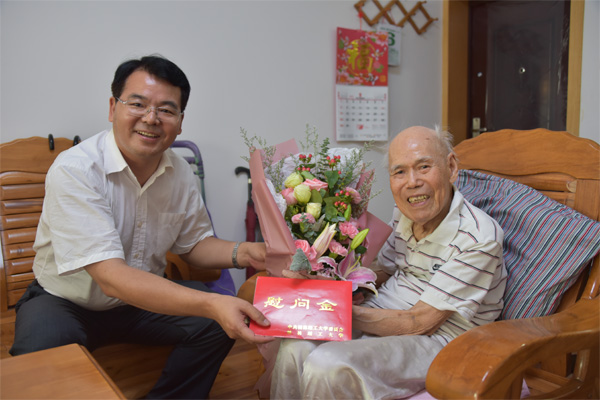 学校校长解庆林(右)慰问地球科学学院温淑女老师