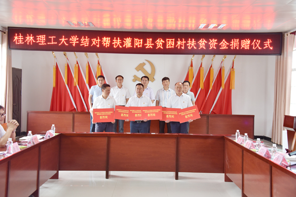 李国忠书记在会上讲话,他强调,今天会议主要任务是深入学习贯彻习近平总书记对黄文秀同志先进事迹的重要批示精神,不忘初心、牢记使命,勇于担当、甘于奉献,推进学校定点扶贫工作,切实为灌阳县打赢脱贫攻坚战作出更大的贡献。他指出,学校党委始终牢记党的脱贫使命,以高度的责任感贯彻“扶贫先扶志,扶贫必扶智”方针,围绕贫困村经济社会发展亟须项目,发挥地方工科高校“产业对接、科技帮扶、技术培育”等优势,通过实施“党建扶贫”、聚焦“科技扶贫”、创新“产业扶贫”、落实“结对帮扶”、开展“扶贫扶志”六个专项行动开展扶贫工作。截至目前,学校定点帮扶灌阳县的6个贫困村全部完成脱贫摘帽任务,取得了良好的扶贫工作业绩。