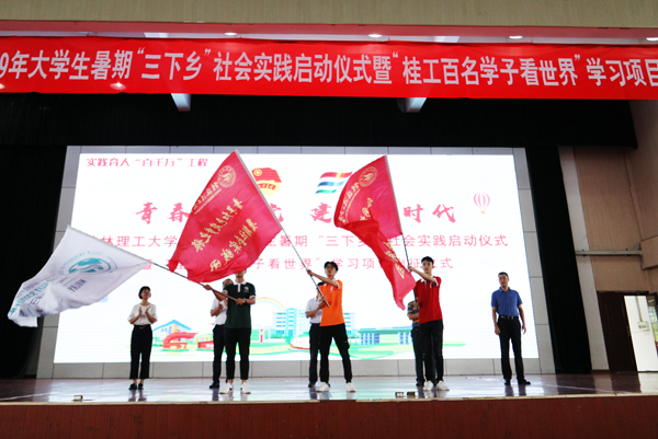 仪式上,2019年学校青马培训班学员黄杰彰同学带领参与社会实践全体师生进行宣誓,出席启动仪式的领导为2019年大学生暑期“三下乡”社会实践团队和“桂工百名学子看世界”学习项目团队授旗。