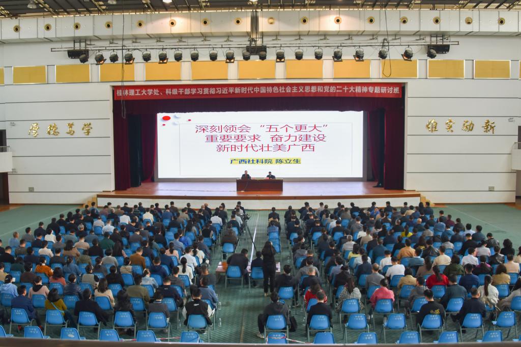 根据学校处、科级干部学习贯彻习近平新时代中国特色社会主义思想和党的二十大精神专题研讨班日常安排,为帮助学校全体处、科级干部进一步深入学习领会“五个牢牢把握”精髓要义,奋力贯彻落实“五个更大”重要要求,3月9日下午,广西社会科学院党组书记、院长陈立生应邀到beat365作题为“深刻领会‘五个更大’重要要求 奋力建设新时代壮美广西”专题辅导报告。报告会由学校党委常委、宣传部部长叶昊主持。全体处、科级干部300余人参加报告会。
