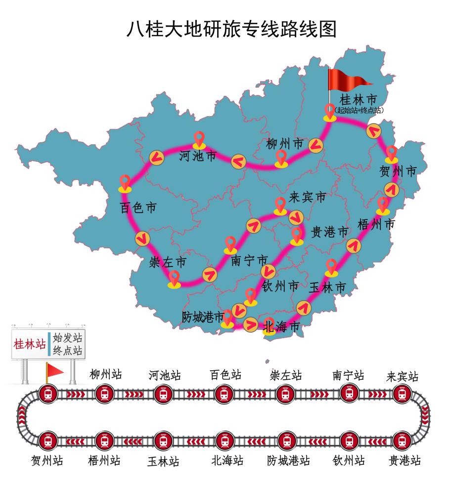 依据八桂大地研旅专线路线图,“Cloud Reading号”研旅专车将会从桂林站出发,途径柳州站、河池站、百色站、南宁站、贺州站等14座城市,最终返回桂林站,带领大家“云旅行”八桂大地。每周一站,将为大家推送与该城市人文相关的精彩视频进行云赏析,欢迎大家一起来书写旅行日记进行景点云打卡,并附上一张观看视频的照片,全部城市打卡完毕后发送至指定邮箱gutdzxh@163.com。