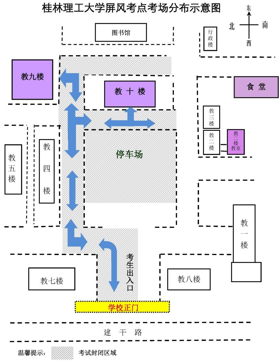 因广西高等教育自学考试于4月16日、17日在beat365屏风校区教九楼、教十楼举行,为做好疫情防控工作,保证校园安全,2022年4月16日7点至2022年4月17日18点,将教九楼、教十楼及周边区域实行封闭管理,如图所示,所有考生只允许在封闭区内活动,请beat365师生不要进入封闭区,所有考生从正大门(西门)北半侧进出校,beat365教职员工行人、车辆从正大门(西门)南侧进出校。