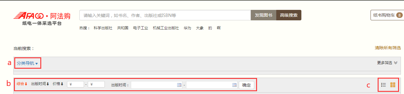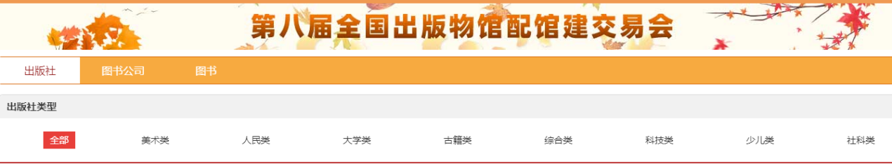 4.2.2 出版社分会场:按出版社综合分类和出版公司名称展示各出版社图书,点击分类首先展示该类别下的出版社名单,点击出版社名称即可进入选书界面。
