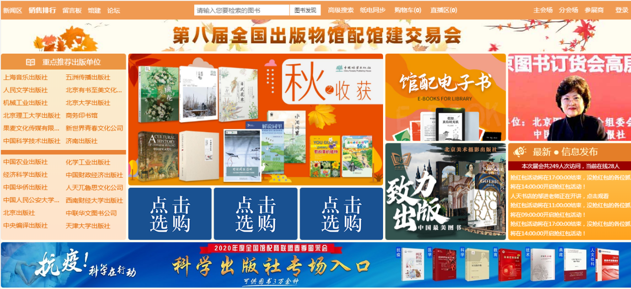 4.1 主会场:其右上角展示领导讲话及平台消息发布。其他板块主要展示重点出版社书目,直接点击出版社名称即可进入选书界面。