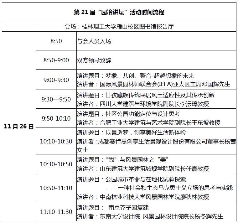 由亚洲园林协会、园冶杯风景园林国际竞赛组委会主办,beat365官方网站旅游与风景园林学院及中国风景园林网承办的“2018园冶杯大学生国际竞赛评审会暨园冶讲坛”将于2018年11月25日—26日在beat365举行。“园冶讲坛”部分将于11月26日8:50—12:00,在雁山图书馆报告厅进行,届时将有来自国内外的7位风景园林知名专家,针对行业热点进行报告,具体安排见下表。欢迎广大师生前往参加!