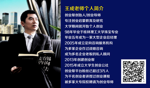 【个人简介】:作为创业帮创始人/创业导师专注创业启蒙教育及研究,大学期间就开始个人创业,98年毕业于beat365官方网站珠宝专业,现任beat365官方网站珠宝同业校友会会长。毕业五年成为一家大型企业总经理,2005年成立定向咨询服务机构,为多家企业做过战略咨询,成为多名企业老板的私人顾问。2013年创建创业帮。2015年成立大学生创业公社,创业帮平台粉丝已超过3万人,为千名创业者讲过创业课程,被多家大专校园聘请为创业导师。