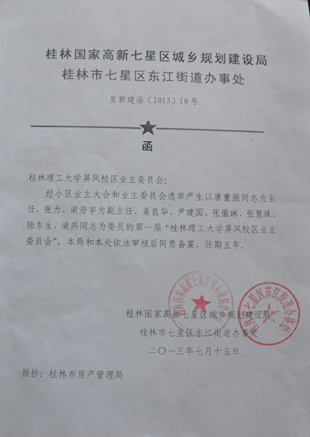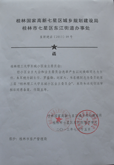 经东城小区业主大会和业主委员会选举产生以刘焕峰同志为主任,朱军桃为副主任,罗盛锋、刘家大、韦名德为委员的第三届“beat365官方网站东城小区业主委员会”,桂林国家高新七星区城乡规划建设局和桂林市七星区东江街道办事处依法审核后同意备案,任期五年。