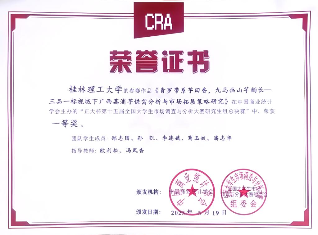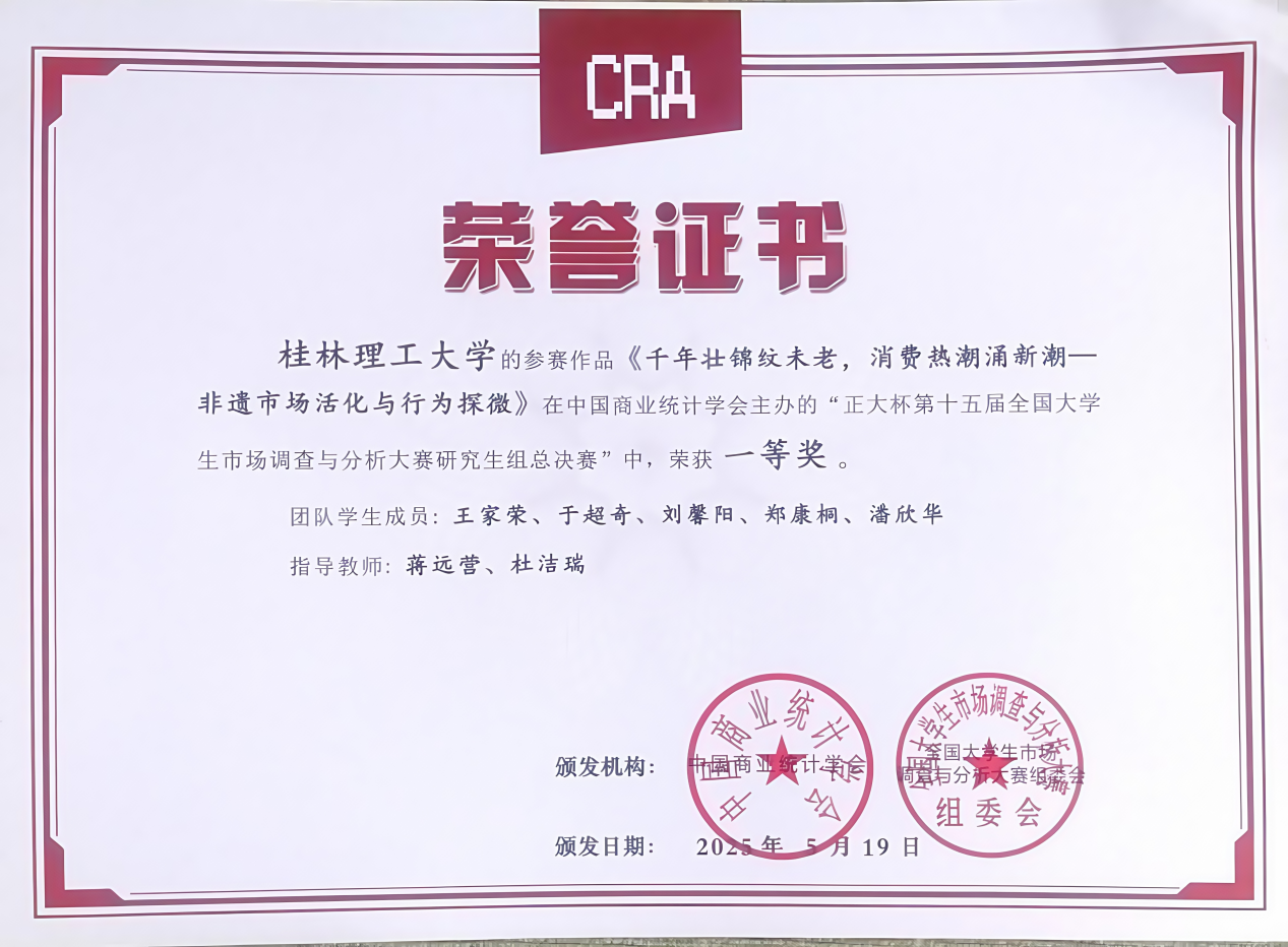 5月25日,由中国商业统计学会主办、正大集团冠名的“正大杯”第十五届全国大学生市场调查与分析大赛圆满落幕。beat365参赛队伍在激烈的竞赛中表现优异,共斩获国家级奖项24项、省级奖项24项,其中研究生组参赛作品《千年壮锦纹未老,消费热潮涌新潮——非遗市场活化与行为探微》《青罗带系芋田香,九马画山芋韵长——三品一标视域下广西荔浦芋供需分析与市场拓展策略研究》、本科生组参赛作品《“合”漓江之韵,“营”生态之境——桂林漓江流域户外露营耦合协调分析与市场拓展研究》均荣获全国一等奖。