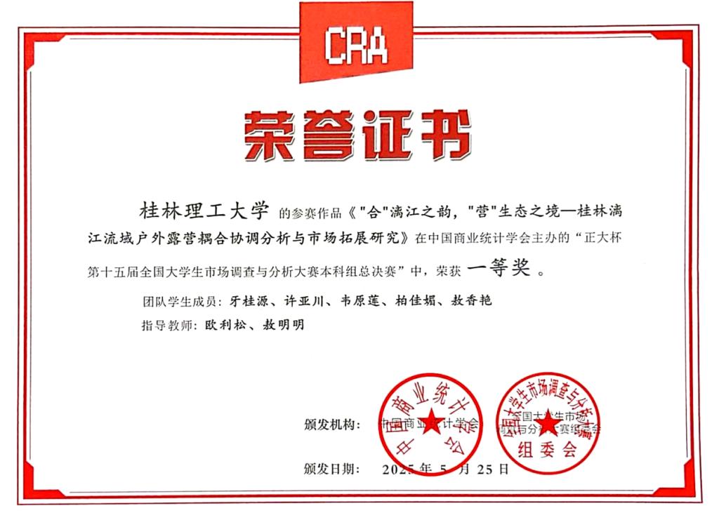 本科生组参赛作品《“合”漓江之韵,“营”生态之境——桂林漓江流域户外露营耦合协调分析与市场拓展研究》斩获本科生组全国一等奖