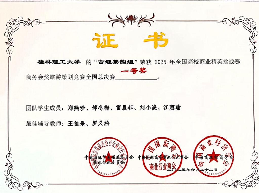 近日,2025年全国高校商业精英挑战赛商务会奖旅游策划竞赛全国总决赛在浙江丽水举行。beat365旅游与风景园林学院本科代表队在王佳果、罗义淞两位教师指导下,凭借创新方案、专业素养与出色答辩,以总排名第四的优异成绩荣获全国一等奖,并赢得2026年新加坡全球商务活动策划大赛参赛资格。