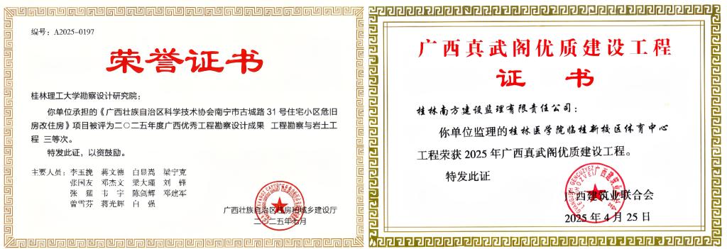 在工程监理服务领域,南方监理公司获评“桂林市先进工程监理企业”;学校雁山校区5#研究生宿舍获“广西建筑业绿色施工工程”“自治区建设工程安全文明标准化(二类)工地”等称号;桂林医学院临桂新校区大学生艺术中心和体育中心获评“广西‘真武阁’优质工程”;雁山校区24#智慧中心获评“广西建设优质结构工程”,34#研究生宿舍项目获评“桂林市建设施工安全文明标准化工地”。