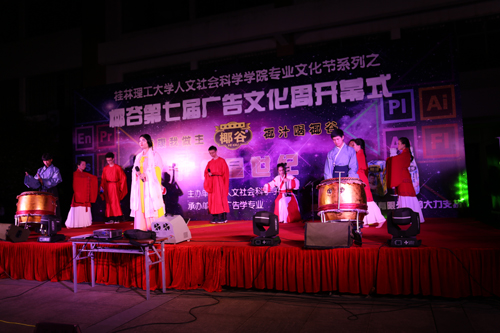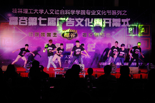 2015年5月29日晚,人文社会科学学院第七届广告文化周“广告星世纪”开幕式在雁山校区教三栋广场隆重举行。学校党委副书记、纪委书记陈贵英,人文社会科学学院领导、老师与同学们一同观看了开幕汇演。 首先由人文社会科学学院党委书记江云清致开幕辞,他希望同学们要充分发挥专业特色,打造校园文化品牌活动,弘扬人文精神;希望同学们志存高远,有所担当,积极践行社会主义核心价值观;希望同学们谨记“勤学、修德、明辨、笃实”的要求,不断与时俱进,多方拓展专业能力,做一个知行合一的广告人。 激情四射的爵士舞《Wiggle Wiggle》拉开了本次活动的帷幕,接下来的表演分为头脑“星”风暴、广告“星”人类、广告“星”创造、广告“星”未来四大板块。节目表演中将传统与现代元素充分融入,既体现了广告人对传统文化的传承、对新媒体文化传播的理解,也展现了广告学子的无限创意,赢得了现场观众的阵阵掌声和喝彩。“星”光璀璨,“星”光闪耀。最后由学院党委书记江云清和第七届广告文化周CEO曾凡东同学共同启动了广告文化周的“火箭之旅”。 广告文化周历今七年,是人文社会科学学院教研室老师为学生量身定做的提升专业技能的活动。该活动通过开幕式、名人堂、交流会、平面展、影视展、闭幕式6个子项目让同学们自己全程策划、招商、执行,在实战中训练提升同学们的项目管理、活动策划、团队合作及运营执行能力,以便更好地适应社会需求,进一步提升广告学专业的知名度和美誉度。
