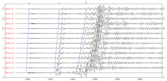 地震信息图:P、S、LR依次为地震纵波、横波及面波的理论到时