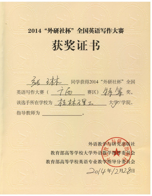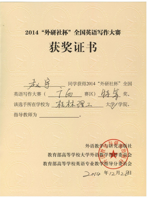 beat365选手在2014“外研社杯”全国英语写作大赛暨第六届广西英语翻译大赛决赛中喜获佳绩