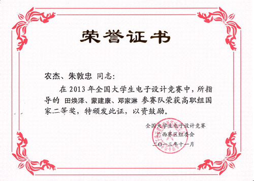 2013年全国大学生电子设计竞赛结果已于日前揭晓,高职学院喜获高职高专组全国二等奖1项,广西赛区专科组二等奖3项。 全国大学生电子设计竞赛是由教育部高等教育司、工业和信息化部人事教育司共同主办的国家级电子设计竞赛,每两年举办一次,旨在培养和提高学生的团队精神、创新思维以及针对实际问题的电子设计、制作综合能力。本届竞赛共有来自全国一千多所院校、一万多支队伍、三万五千多名学生报名参赛。 高职学院学生在本届竞赛中取得的成绩是学院大力加强技能培养、提升实践教学质量的有效成果,充分展现了该院学生努力拼搏、求真务实、开拓创新、追求卓越的优良品质。