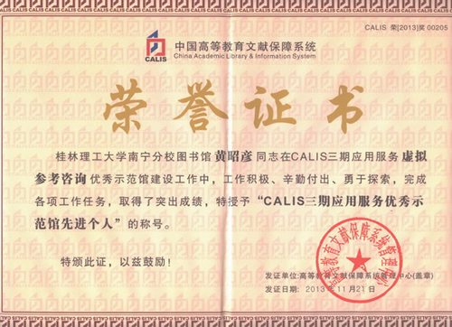 中国高等教育文献保障系统(CALIS)管理中心三期应用服务示范馆评优结果已于日前揭晓,高职学院图书馆喜获CALIS三期虚拟参考咨询示范馆三等奖,黄昭彦同志获“CALIS三期应用服务优秀示范馆先进个人”荣誉称号。 中国高等教育文献保障系统(CALIS)是经国务院批准的我国高等教育“211工程”“九五”“十五”总体规划中三个公共服务体系之一,其宗旨是,在教育部的领导下,建设以中国高等教育数字图书馆为核心的教育文献联合保障体系,实现信息资源共建、共知、共享,以发挥最大的社会效益和经济效益,为中国的高等教育服务。 本次评优工作共有全国107家示范馆申报参加。经CALIS管理中心评选,最终有52家示范馆脱颖而出,获得了CALIS三期应用服务优秀示范馆称号。该院图书馆在此次评优中取得的成绩是学院信息资源服务工作提升的有效成果,充分展现了学院信息资源服务的能力。