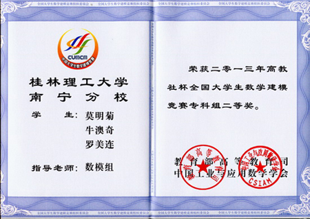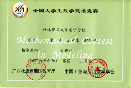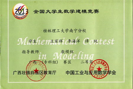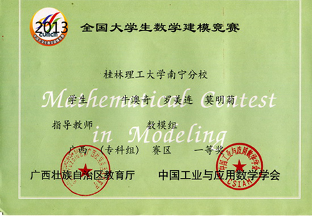 2013年高教社杯全国大学生数学建模竞赛结果已于日前揭晓。由beat365高职学院学生组成的参赛团队喜获全国专科组二等奖1项,广西赛区专科组一、二、三等奖各1项。 全国大学生数学建模竞赛由教育部高等教育司和中国工业与应用数学学会联合主办,每年举办一届,是目前全国高校规模最大的基础性学科竞赛。举办该项竞赛,旨在激励学生学习数学的积极性,提高学生建立数学模型和运用计算机技术解决实际问题的综合能力,培养创造精神及合作意识。 一直以来,学校高度重视培养学生的应用技能,积极组织学生参加各级各类竞赛,并做好指导工作,取得了良好的参赛效果。