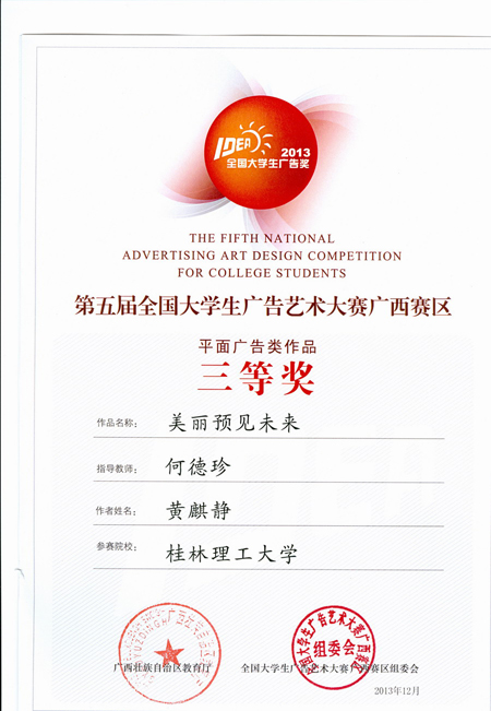 12月15日上午9点,由广西壮族自治区教育厅、全国大学生广告艺术大赛广西赛区组委会主办的第五届全国大学生广告艺术大赛广西赛区颁奖典礼在广西艺术学院音乐厅举行。beat365艺术学院与人文学院共有8件作品入围决赛,最终获得了本次大赛中5个三等奖、3个优秀奖。 全国大学生广告艺术大赛简称大广赛,赛事每两年举办一次,是全国大学生广告艺术大赛组委会承办的唯一全国性高校文科大赛。大广赛旨在提高大学生的创新精神和实践能力,激发大学生的创意灵感,促进大学新闻传播、广告、设计、艺术教育等学科的人才培养模式的改革。