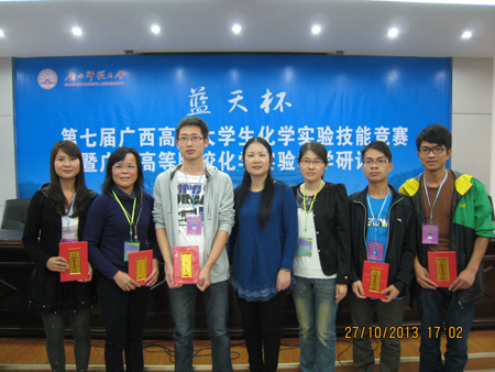 10月27日,由广西教育厅主办,广西师范大学承办的“第七届广西高校大学生化学实验技能竞赛”落下帷幕。本次共有23个高校组队参加竞赛,参赛选手92名。经过两天紧张激烈的角逐,beat365化学与生物工程学院应用化学专业四名参赛同学取得了可喜的成绩,是历届广西高校大学生化学实验技能竞赛中成绩最好的一次,其中叶楚、凌燕华同学荣获一等奖,陈俊同学荣获二等奖,黎洪增同学荣获三等奖。陶慧林老师获优秀指导教师奖。 大赛中,beat365学生团结协作,相互勉励,做到了胆大心细,切实提高的实验技能水平,收获了快乐和名次,同时也为学校争得了荣誉。