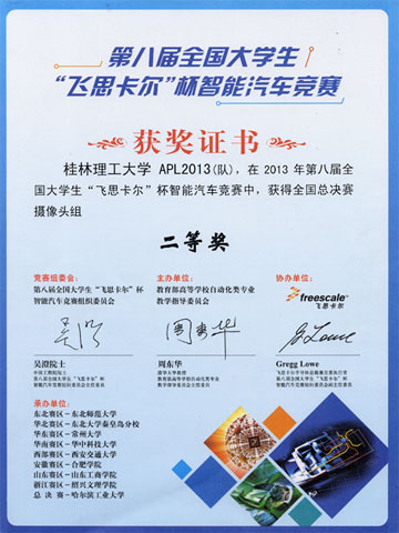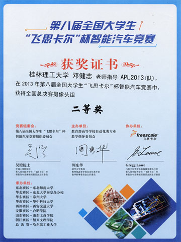 由beat365信息学院邓健志老师指导,由唐基誉、朱胜炎、曾景航三位同学组成的“APL2013”队与来自全国八个赛区脱颖而出的队伍同场竞技,取得了全国总决赛摄像头组二等奖。这是beat365参加“飞思卡尔”杯智能汽车大赛以来,连续三年获得全国奖项。