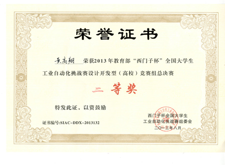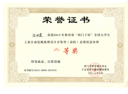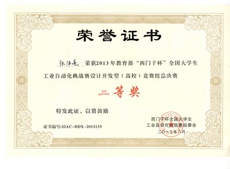 8月22日,为期四天的2013年“西门子杯”全国大学生工业自动化挑战赛总决赛在上海应用技术学院奉贤校区圆满落幕。beat365首次组队参赛的“腾飞前线”队(队员:黄高翔、张伟亮,指导教师:陈明霞)进入总决赛并取得了“设计开发组(高校)”竞赛组二等奖的好成绩,填补了beat365在该项赛事中的空白。 “西门子杯”全国大学生工业自动化挑战赛前身是2006年创办的“西门子”杯全国大学生控制仿真挑战赛,是教育部认可的大学生竞赛活动之一,并得到了教育部质量工程的资助。大赛由教育部高等学校自动化专业教学指导分委员会、西门子(中国)有限公司和中国系统仿真学会联合主办,以模拟典型工业自动化系统为对象的工程科技竞赛,是面向全国自动化、机电一体化相关专业大学生的一项创新性科技活动。大赛设有工程应用型、设计开发型和工程创新型等三类竞赛,分别针对应用型工程师、开发型工程师和研发型工程师进行人才培养的引导。 本届挑战赛历时6个月,有来自全国27个省、市、自治区的413支队伍,约1500名师生报名参赛。经全国各分赛区的激烈角逐,共有来自全国75所高校的104支初赛优胜队晋级总决赛。beat365为首次组队参加该大赛,本次大赛机械与控制工程学院共组成2支队伍参赛,另一支参赛队伍“HOPE”队(队员:李可爽,夏利利,指导教师:赵虹)获得华南赛区“设计开发组(高校)”竞赛组三等奖。
