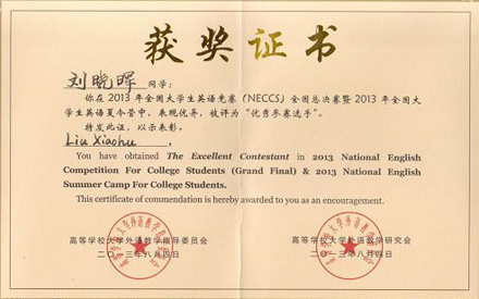 日前获悉,在2013年全国大学生英语竞赛(NECCS)全国总决赛暨2013年全国大学生英语夏令营中,beat365外国语学院英语专业学生刘晓晖和地球科学学院勘查技术专业学生俞若水发挥出色,取得了好成绩,为beat365赢得了荣誉。