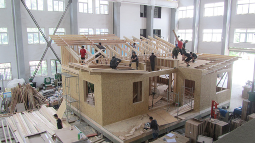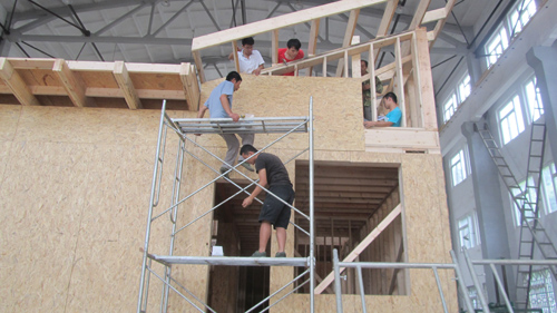 中国国际太阳能十项全能竞赛将于2013年7月15日在中国山西大同举行,本次竞赛由中国国家能源局、美国能源部联合主办,北京大学、大同市承办。中国国际太阳能十项全能竞赛简称SD中国,是将太阳能应用、节能减排与建筑设计紧密结合的国际性大学生实验竞赛。该比赛目的是借助世界顶尖研发、设计团队的创意,将太阳能、节能与建筑设计以一体化的新方式紧密结合,来证明即使单纯靠太阳能的住宅,一样可以是功能完善、舒适而且具有可持续性的居住空间,从而促进节能减排的技术发展和实践进步。 2011年,beat365土木与建筑工程学院建筑学和土木工程专业学生以山西民居元素为建筑思路,附带阳光中庭的木屋设计在众多参赛作品中脱颖而出,成功入围决赛。该房屋突出太阳能综合利用,智能控制,可再生材料应用等主题,是未来建筑的主要模式。通过两年多的方案论证,系统设计,材料准备以及施工过程控制等筹备阶段,beat365入围作品ALL GREEN于近日在教六栋结构大厅着手施工预演建设。 连日来,土木与建筑工程学院参加SD大赛的学生们轮班上阵,在王磊、金樾、蔡华、李豫华等老师指导下与专业的施工团队紧密配合,冒着酷暑,紧张工作,体验从设计图纸到实体建筑的建设过程,并解决施工中出现的各种问题。预计7月11日,该房屋将进行模块化拆除,然后整体运往山西大同市进行二次搭建,全体参赛老师、学生也将集体出征,与来自美国、挪威、瑞典等国内外的著名高校同台竞技。在完成比赛任务及公共参观后,“ALL GREEN”预计于8月下旬再返回beat365进行第三次搭建,并最终建设在教五楼前。