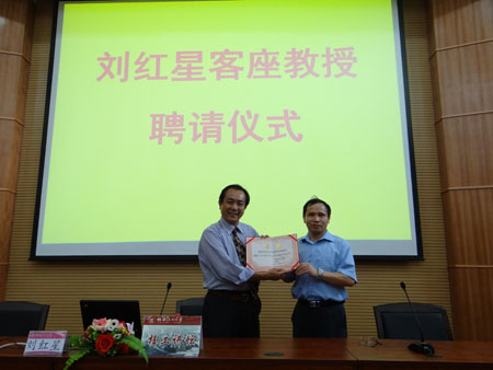 周国清副校长(右)为刘红星教授颁发客座教授聘书