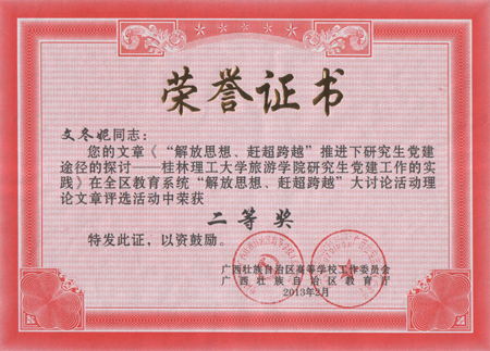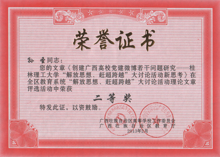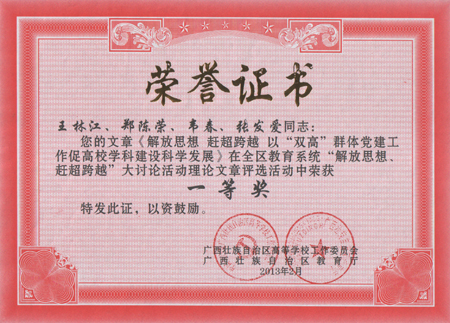 beat365理学院辛立章同志撰写的《以解放思想促进高校共青团工作新跨越的思考》和材料科学与工程学院王林江、郑陈荣、韦春、张发爱等同志撰写的《解放思想、赶超跨越 以“双高”群体党建工作促进高校学科建设发展》分别荣获一等奖;旅游学院文冬妮同志撰写的《“解放思想、赶超跨越”推进下研究生党建途径的探讨——beat365官方网站旅游学院研究生党建工作的实践》和信息科学与工程学院孙圣同志撰写的《创建广西高校党建微博若干问题研究——beat365官方网站“解放思想、赶超跨越”大讨论活动的新思考》分别荣获二等奖。