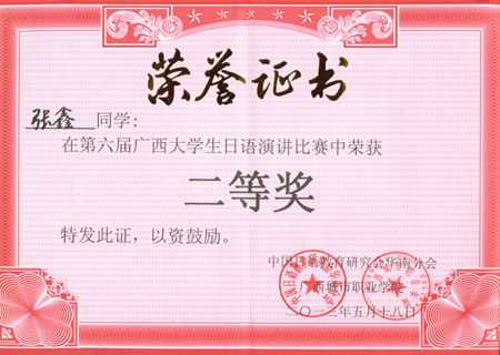 日前,第五届广西大学生日语演讲比赛在南宁落下帷幕。beat365外国语学院日语专业2010级1班张鑫同学在比赛中表现优异,取得了本届日语演讲比赛第二名的好成绩。 此次广西大学生日语演讲比赛由中国日语教学研究会华南分会主办、广西城市职业学院承办。来自广西13所开设日语专业的高校25名选手参加了比赛。比赛设一等奖1个,二等奖2个和三等奖3个。 长期以来,外国语学院注重学生专业技能的培养和综合素质的提升,积极鼓励和组织学生参加各类外语竞赛活动,并以赛促教、以赛促改、以赛促学,不断提高人才培育质量。