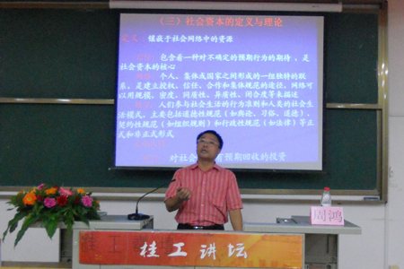 近日,河池学院副院长、广西社会学学会副会长、广西管理学学会副会长周鸿教授做客桂工讲坛,在雁山校区07519教室为beat365学生带来了一场题为《社会资本与区域合作》的专题讲座。讲座由人文社会科学学院常务副院长黄琳庆教授主持,人文社会科学学院相关专业教师和学生近200多人到场聆听报告。 报告会上,周鸿教授详细介绍了社会资本的基本理论,深入浅出地阐释了社会资本在区域合作中的运行机理,深刻剖析了我国区域合作的困境以及北部湾发展滞后的主要原因,积极探讨了区域合作中社会资本投资策略的路径依赖问题。最后,周鸿教授还热情地为学生解答了大学生成长中应如何有效积累社会网络资本等问题。 周鸿教授学识渊博,逻辑缜密,语言幽默,所作报告内容丰富,案例典型,既丰富了beat365师生的社会科学知识,又有效地拓宽了beat365师生的学科视野。