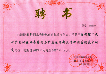 2013年1月14日上午,市委、市政府举行桂林市首批“漓江学者”聘任仪式,正式聘任5名专家为桂林首批漓江学者。市委书记、市人大常委会主任刘君,市长李志刚分别为5名漓江学者颁发聘书。beat365地球科学学院熊彬教授光荣入选,受聘为beat365“广西地区地壳结构与矿集区深部立体探测关键技术研究”岗位漓江学者。beat365陈贵英副校长参加了会议。 桂林市首批“漓江学者”共有5名,是从报名的20多名国内外专家、学者中经专家评审答辩、市委人才工作协调小组会议和市委组织部部务会讨论、市委研究审定、拟聘任公示等招聘程序选拔出来的。 熊彬教授,生于1974年,湖北仙桃人,中共党员,博士,教授,博士生导师。熊彬教授作为自治区重点学科“地球探测与信息技术”的学术带头人,主要从事电磁地球物理理论与方法、电磁法数值模拟及反演成像等方面的教学及科研工作。曾先后主持国家高技术研究发展计划(863计划)、国家自然科学基金项目、教育部博士点基金新教师项目、省(自治区)自然科学基金项目、中国地质调查局地质调查工作项目的研究。在《地球物理学报》、《地球科学》、《吉林大学学报》、《中南大学学报》、《地球物理学进展》、《International Journal of Geophysics》、《Journal of Geophysics and Engineering》等国内外学术刊物上合作公开发表学术论文或会议论文60余篇。曾荣获湖南省第十一届、十二届“自然科学优秀论文一等奖”、湖南“何继善基金青年科技奖”、“广西科学技术进步奖二等奖”、“中国地球物理学会科学技术进步奖三等奖”、“广西自然科学奖三等奖”,2010年入选“广西高校优秀人才资助计划”,享受beat365官方网站拔尖人才特殊津贴。熊彬教授兼任第二届地球电磁专业委员会常务委员会委员、广西地球物理学会第三届理事会常务理事、广西地质学会第八届理事会副秘书长。 熊彬教授获聘为漓江学者,是桂林市委、市政府对其学识、能力、业绩和品行的充分肯定与高度认可,同时也是对其引领和服务桂林经济发展的信任与期望,是beat365的光荣。我们期望熊彬教授争做自主创新的先锋,力推科学研究、技术创新、产业发展相结合,大力培养青年人才,建设一流创新团队,为学校的学科建设与发展做出卓越的贡献。
