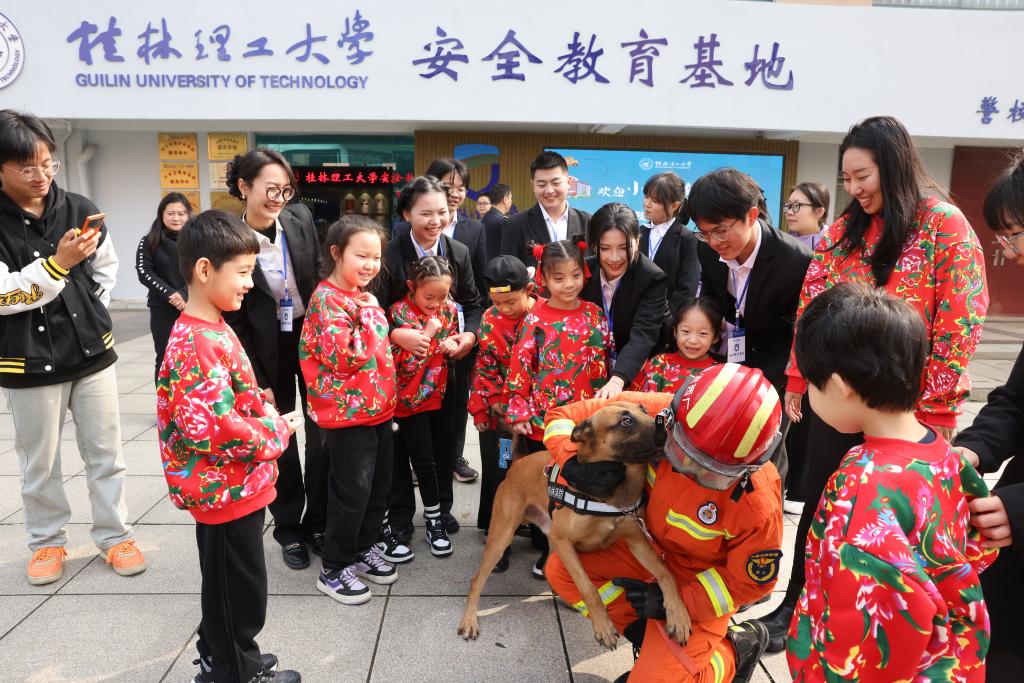 “坐、卧、立、叫、来、靠……”,随着训导员标准的手势和洪亮的口令,搜救犬迅速作出反应,坐、卧、立等动作一气呵成,赢得了小朋友们的欢呼鼓掌。大家兴致勃勃,亲密抚摸搜救犬,并利用球绳玩具与搜救犬开展互动游戏,过程十分温馨有爱。