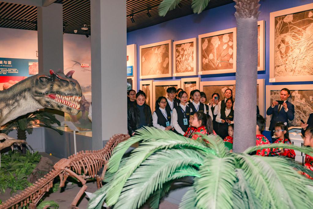 千奇百态的展厅里,古生物化石、矿物、陨石、岩石、矿石和宝玉石等6000余件珍贵标本让小朋友们目不暇接、惊叹不已。全国馆藏最长的13m鱼龙化石、重达650公斤的自然铜标本、来自宇宙重达3.5t的南丹铁陨石、曾经生长在广西长达19米的扶绥龙(模型)、在荧光灯作用下可“发光”的矿物晶体、来自遥远南极的岩石标本、产自广西桂林的鸡血玉、丰富多彩的矿物晶体……不仅让“小冻梨”们走进了博物馆,也走近了地球。