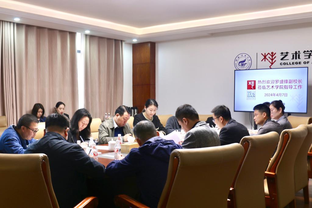 罗盛锋对艺术学院取得的新进展新成绩表示充分肯定,对学院提出的工作思路表示赞同。他指出,艺术学院要深入分析研判当下面临的新形势、新挑战、新任务,主动适应国家战略发展新需求和高等教育发展新趋势,奋力推动学院各项事业发展驶入快车道。他强调,一是要认真学习贯彻习近平总书记关于教育的重要论述和在广西视察时的重要讲话精神,按照学校党委三届七次全会和学校处级领导干部培训班提出的要求,坚持党建引领,充分发挥基层党组织战斗堡垒作用和党员先锋模范作用,在推进党建与业务深度融合上走在前作表率,推动学院高质量发展开创新局面。二是要聚势谋远,锚定目标,舞动学科建设龙头,推动学科建设上台阶。要进一步凝练学科方向,明确学科建设目标,咬定青山不放松,持续发力、久久为功,持续推动学科建设上水平、显特色、出高峰。三是要对标对表,扬长避短,深入开展产教融合,强化专业群建设,凸显人才培养新特色。要主动服务国家战略和现代产业体系,深化产教融合,主动深入对接社会需求,与行业企业联动培养人才,强化学生的实践应用能力和创新创业能力,培养富有创新精神和实践能力的高素质人才。四是要组团队,强内涵,进一步优化结构,彰显建设高水平师资队伍的新担当。坚持引育并举,强化人才队伍建设,加强“双师型”教师培养,促进教师队伍的年龄结构、学历结构、职称结构进一步优化,教学能力、实践能力、职业能力进一步提高。以凝聚优秀创新人才为主体,不断加强高水平学科带头人培养,加大力度培育创新团队,孵化出一批优秀的教师精英与教学团队。五是要保民生,促稳定,全员参与抓好毕业生就业这个最大的民生,牢牢守好安全稳定底线。要准确把握毕业生就业创业工作新形势,加强组织领导,压实工作责任,千方百计促进毕业生多渠道就业创业,推动 2024届毕业生高质量充分就业。要深刻认识安全稳定工作的重要性,以过硬的举措切实维护政治安全、意识形态安全、消防安全、师生人身财产安全等各项安全,筑牢学院高质量发展基石。