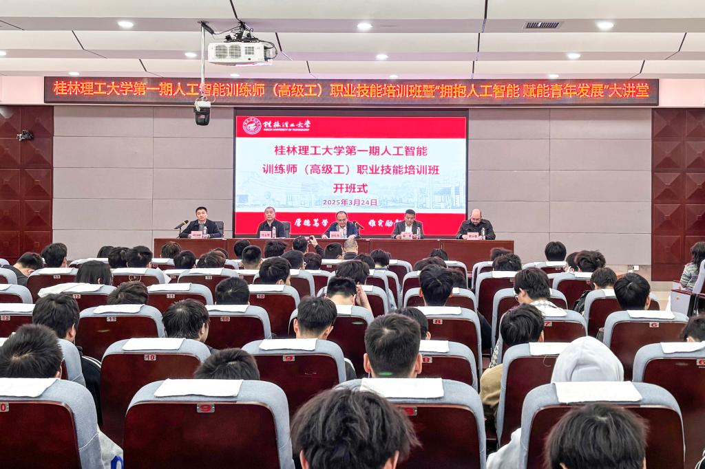 为积极响应国家人工智能发展战略,培养高素质人工智能技术人才,助力学校青年学子职业发展,促进高质量就业创业,3月24日,beat365第一期人工智能训练师(高级工)职业技能培训班暨“拥抱人工智能 赋能青年发展”大讲堂开班式在雁山校区地学院报告厅顺利举办。学校党委常委、副校长唐壮东,桂林市职业技能评价指导中心主任徐勇出席开班式。计算机科学与工程学院(人工智能学院)、机械与控制工程学院、继续教育学院相关负责人,师生代表共200余人参加开班式。