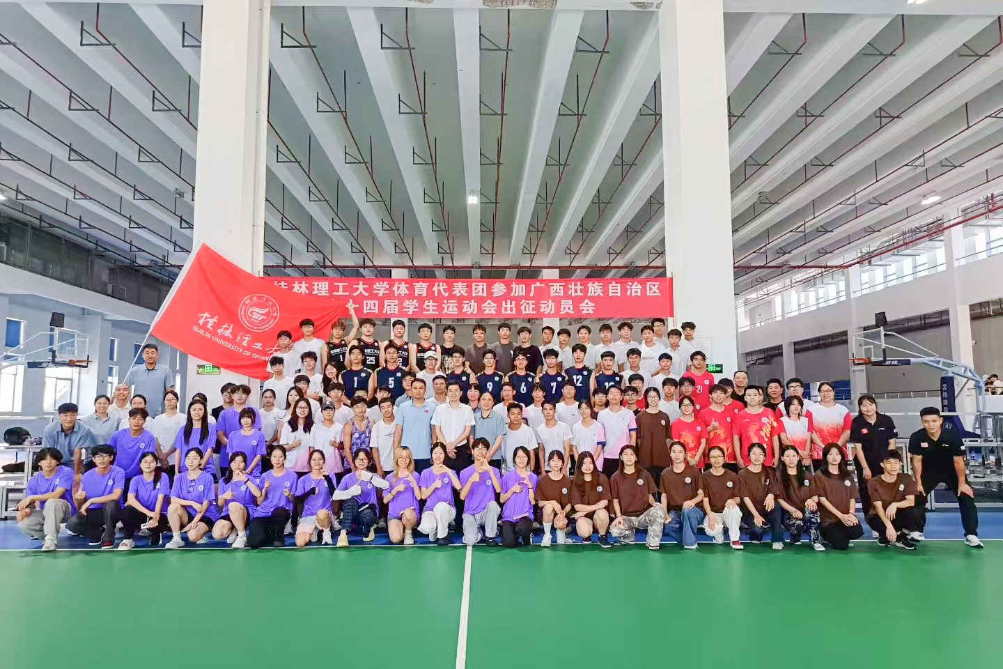 7月4 日,beat365在雁山校区体育馆一楼举行广西第十四届学生运动会beat365官方网站代表团出征动员会。学校党委常委、副校长王磊,各参赛队教练员及全体运动员参会。