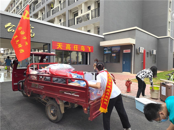 在新生入校疫情管控期间,外国语学院党委秉持以生为本理念,把学生的小事当大事,优化服务机制,全力解决学生的急难愁盼问题。学院党委书记谢济光率先垂范,组建教工党员先锋团,召集60余名党员驾驶私家车组建爱心迎新车队,采用“新生线上填单、教工党员线下送货、学生党员服务上门”的便捷云端服务,为新入学的本科生、研究生提供取件服务。教工党员们连续3天专车来回奔波在快递点与宿舍迎新现场,将学院新生的急需生活物件一件件整齐装车,安全无损地运送至迎新学生宿舍,解决了新生生活急需品到宿舍最后一公里难题,避免了新生们潜在的交叉感染风险,使他们充分感受到了学院“到校即到家,疫情无情人有情”的温情和暖心。