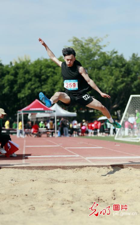 2022年11月3日,广西beat365官方网站南宁分校,运动员参加跳远比赛。当日,该校举办第31届田径运动会,学生与教职工运动员同场竞技,展现新时代大学师生风采。(卢文斐摄/光明图片)