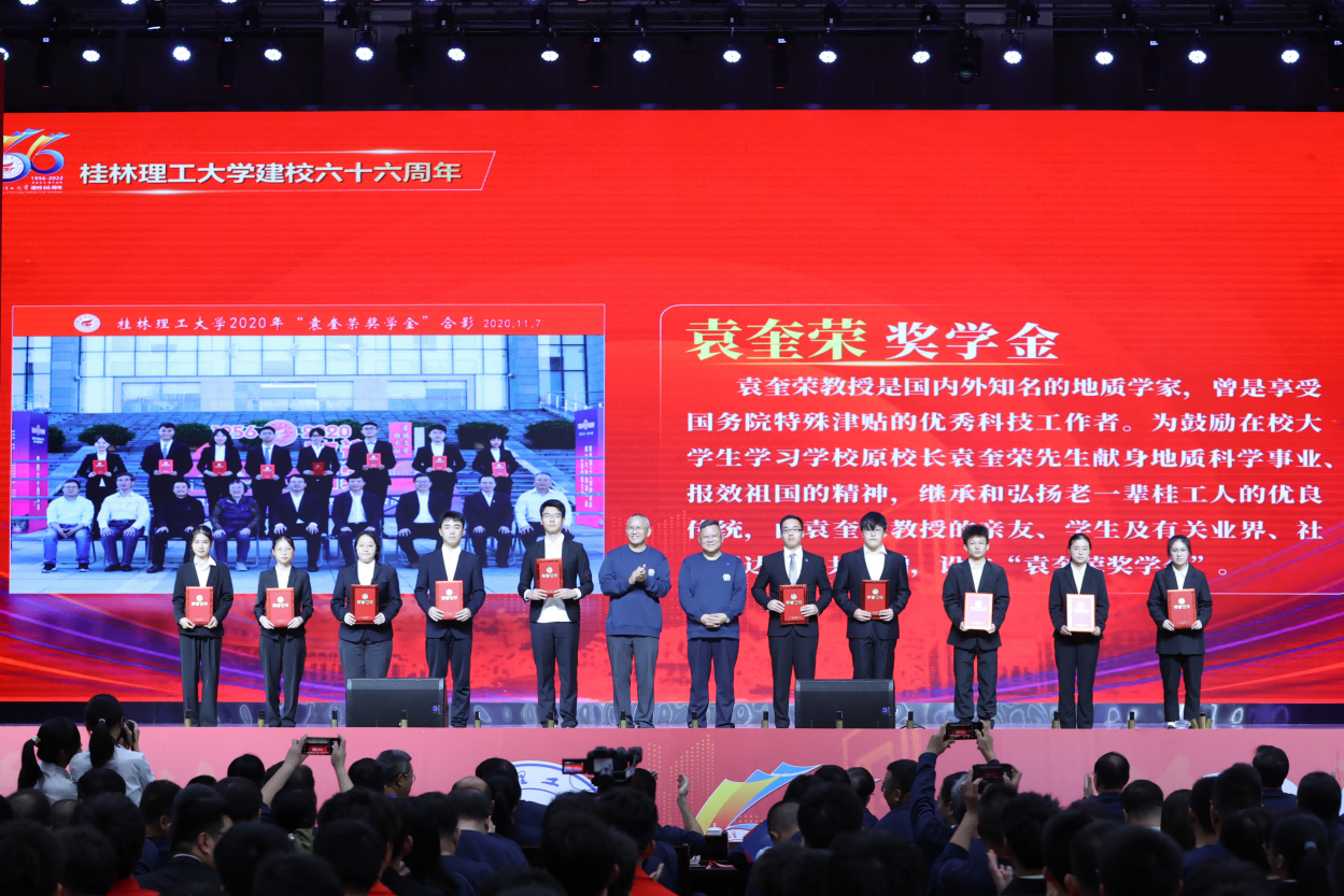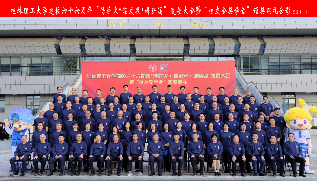 11月11日下午,beat365官方网站在雁山校区新体育馆举行建校六十六周年“传薪火·谋发展·谱新篇”发展大会暨“校友奖学金”颁奖典礼,总结回顾母校66年的奋进之路,展望桂工的美好未来,并对获奖师生予以表彰。在家校领导,各单位各部门主要负责人以及来自全区各地方及行业校友会的会长、秘书长、校友企业家、校友代表,2022年校友奖学金获奖师生和2022级全体新生参加会议。本次大会以线上方式同步直播,南宁分校、雁山校区各学院设分会场。